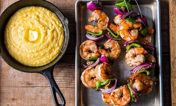 Remove the shrimp skewers from the grill. Remove the skewers from the shrimp and vegetables and place the shrimp and vegetables on the grits. Garnish with cilantro and serve warm. Enjoy!